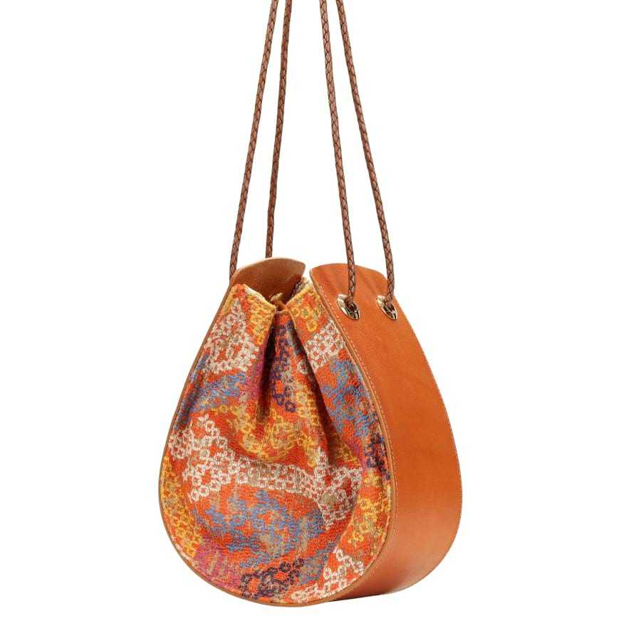 Elevate your everyday style with this handcrafted drawstring artsy shoulder bag, created by a skilled fiber artist. The design pairs warm, caramel-toned leather with a vibrant woven textile front, featuring a richly textured multicolor pattern that feels both artful and timeless. The soft, gathered silhouette adds a relaxed elegance, while sturdy braided straps thread through metal grommets for a secure and comfortable carry. Perfect for those who appreciate one-of-a-kind craftsmanship, this bag brings color, character, and artisan quality to every outfit.