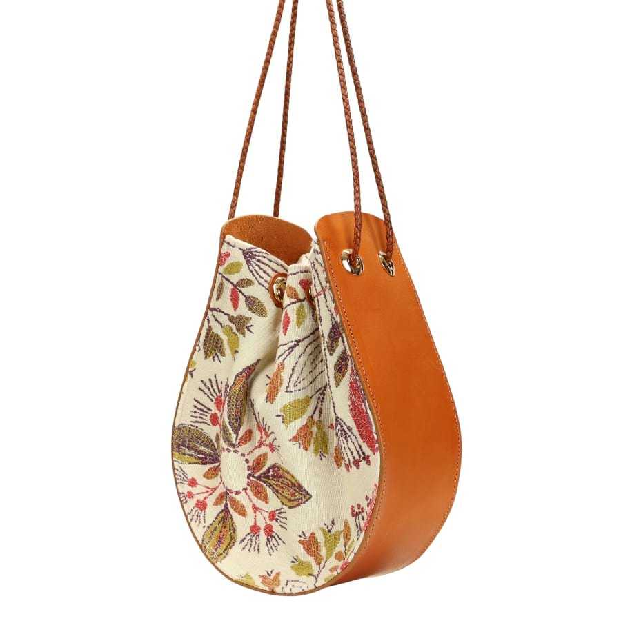 Elevate your everyday style with this handcrafted drawstring artsy shoulder bag, created by a skilled fiber artist. The design pairs warm, caramel-toned leather with a vibrant woven textile front, featuring a richly textured multicolor pattern that feels both artful and timeless. The soft, gathered silhouette adds a relaxed elegance, while sturdy braided straps thread through metal grommets for a secure and comfortable carry. Perfect for those who appreciate one-of-a-kind craftsmanship, this bag brings color, character, and artisan quality to every outfit.