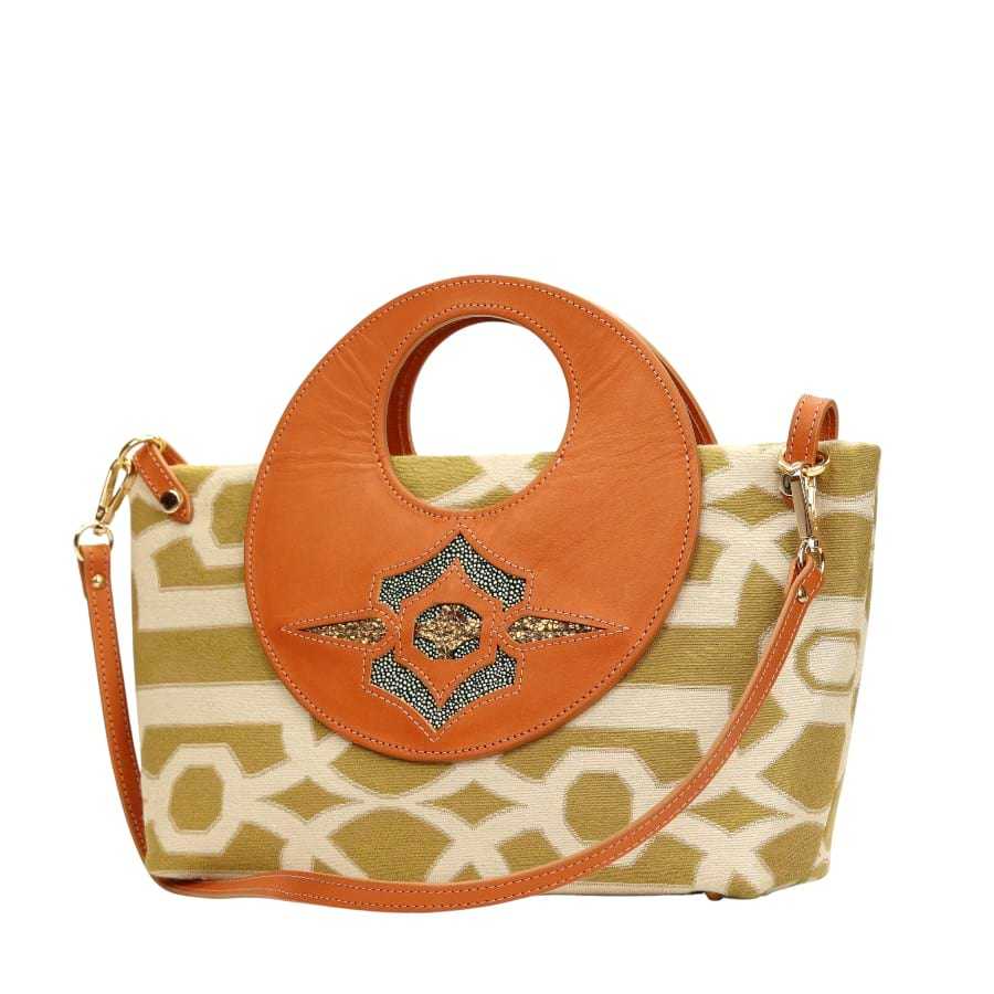 Make a bold, artful statement with this handcrafted purse, created by a skilled fiber artist. The bag combines warm caramel leather with a striking geometric textile in soft olive and cream tones, blending modern pattern with handcrafted detail. Its most distinctive feature is the sculptural circular leather handle—smooth, comfortable to carry, and adorned with an intricate motif that adds shimmer, texture, and a touch of bohemian elegance.